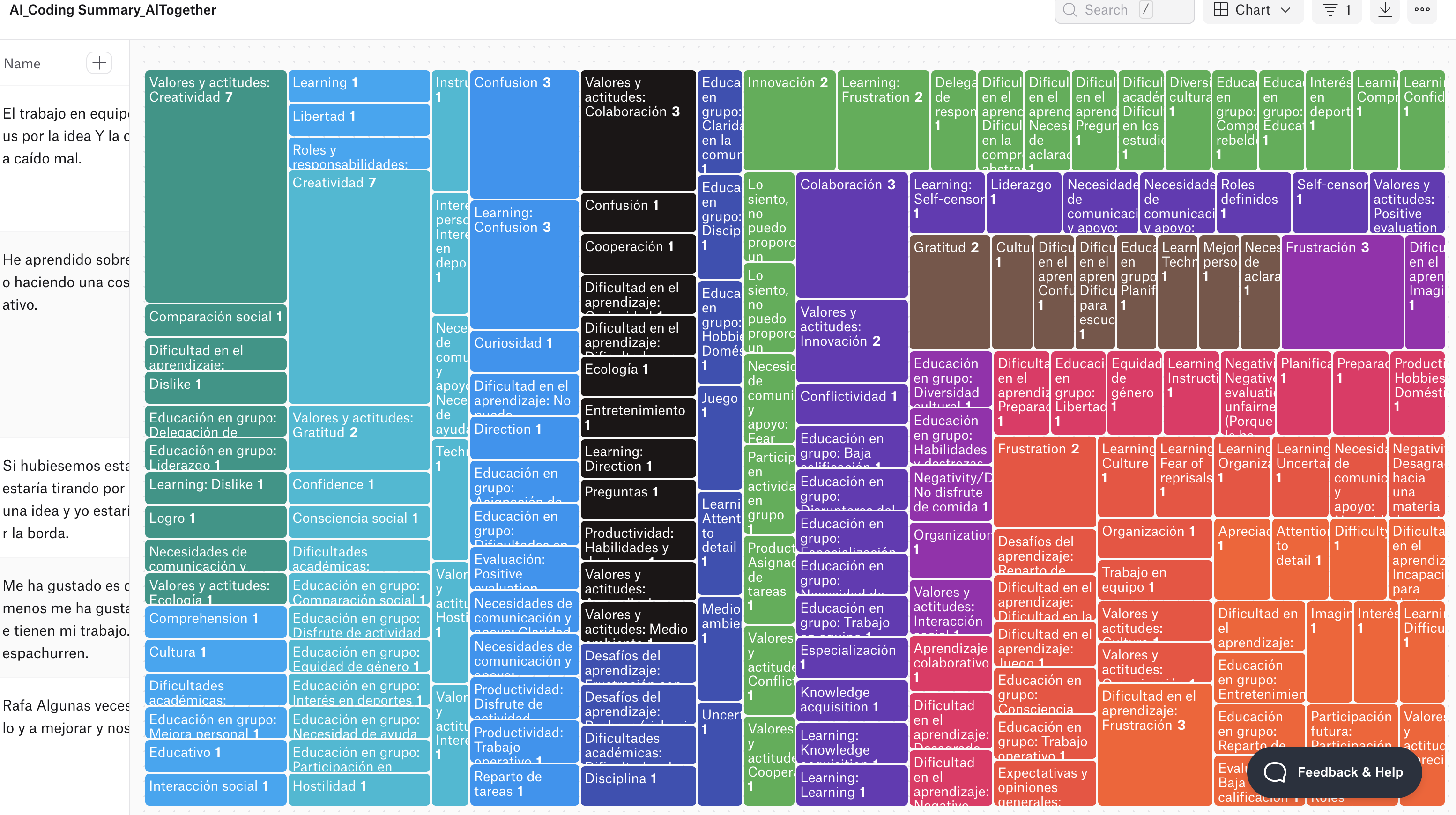 In conjunction with AI coding, we also employed a “manual coding” approach, which involved a meticulous examination of the data to identify relevant themes and assign appropriate codes manually. In a natural language, read your notes and transcripts as many times as necessary, until you assign codes to words, phrases, or paragraphs that represent sentiments or behavior patterns. This thorough and systematic review ensured comprehensive coverage of key themes. To visualize the distribution and significance of these codes, we employed a TreeMap, as depicted in the accompanying figure.